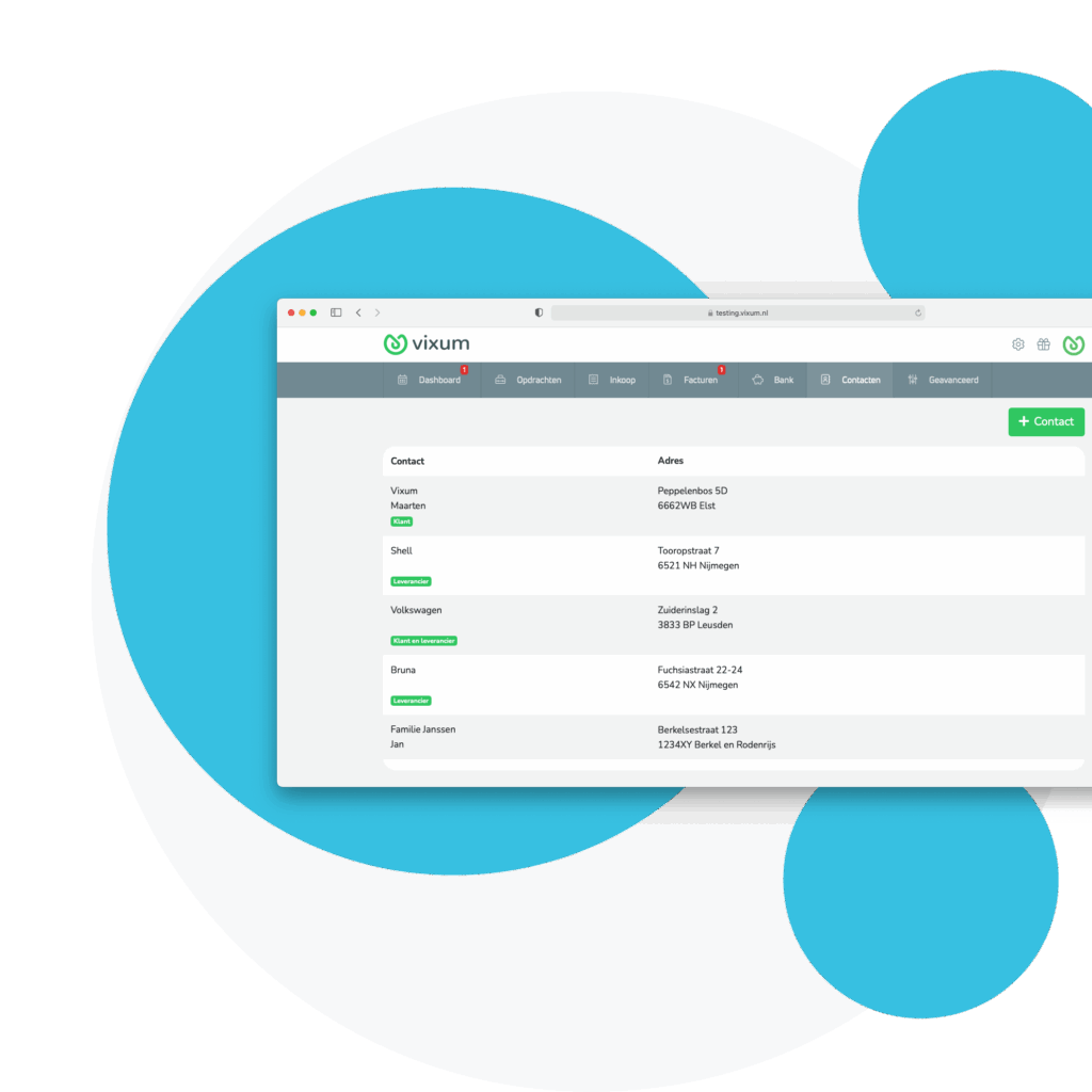 Vixum biedt een alles-in-één oplossing voor een goed beheer van je klant, contact en leverancier gegevens. Telkens weer opzoek gaan naar de gegevens van je klanten en leveranciers is vanaf nu voorbij. In Vixum heb je alles bij de hand.